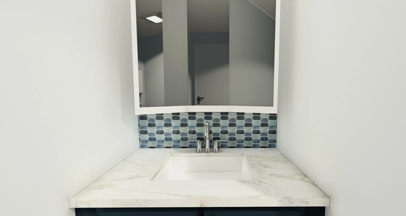 This project began with an artistic couple looking to transition over a handicapped bathroom to a primary suite oasis. The client wanted blues, whites, and grays assembled into a dreamy spa-like setting so she and her husband had a place to retreat to after a long day of work. The images for this project are arranged in before, rendered and final order.